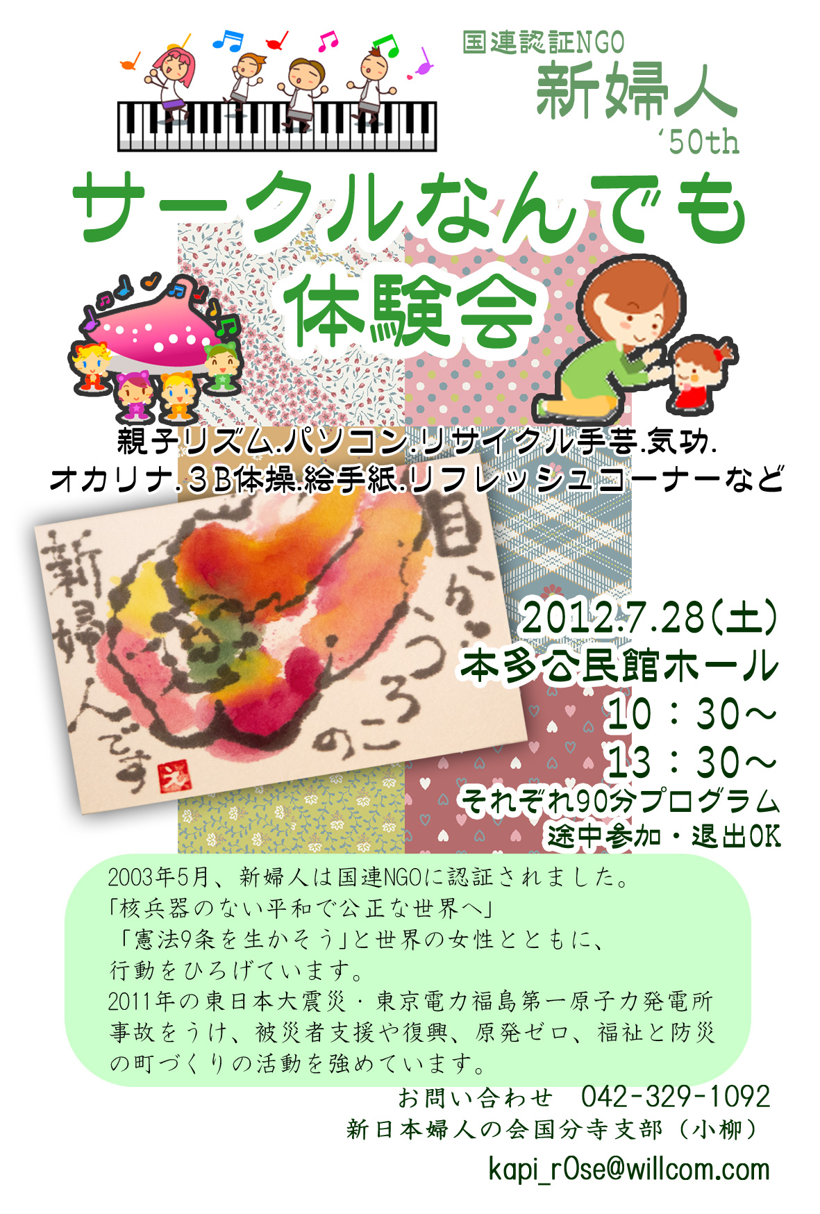 なんでもサークル体験会 サークル 2012年07月14日 新婦人ってどんなとこ?こんなとこ ^^ただいま準備中です。楽しみ!わたし本気でこの日が楽しみです~♪ [1回] http://shinfujinbunji.ria10.com/Entry/42/なんでもサークル体験会