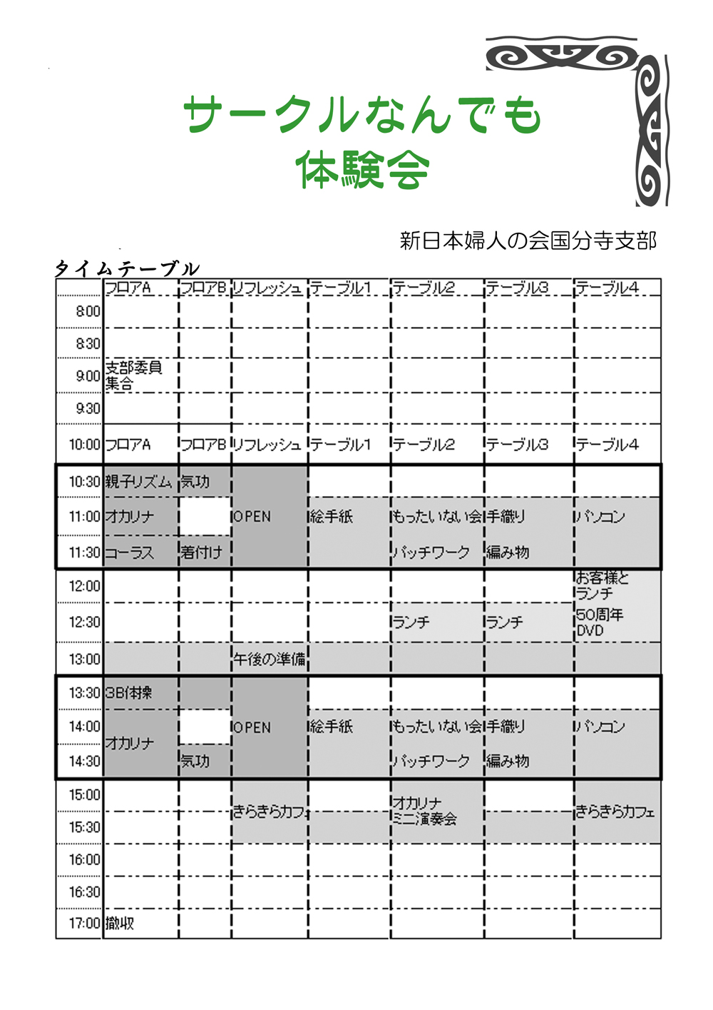 なんでもサークル体験会 タイムテーブル サークル 2012年07月27日 地域にチラシを配布させていただいております。タイムテーブルはチラシに載せておりませんので、ご参考にしてください。親子でご参加の方は、午前中にぜひお越しください。親子リズムの体験をしていただけます。午後の身体を使う体験は3B体操。気功は午前も午後も体験できます。その他、パソコンや英会話、絵手紙、パッチワークなどのテーブルを使う体験は、午前も午後も開催です。参加の方は、体験会後のランチタイムは、ご持参いただいたお昼をホールで召し上がってくださいね。午後の体験会後はキラキラカフェタイムを開きます。どうぞ一休みしてください。クリックすると大きくなります。もちろん!午前も午後も両方~という方も歓迎。どうぞお気軽にお越しください。お待ちしております。 [2回] http://shinfujinbunji.ria10.com/Entry/43/なんでもサークル体験会 タイムテーブル