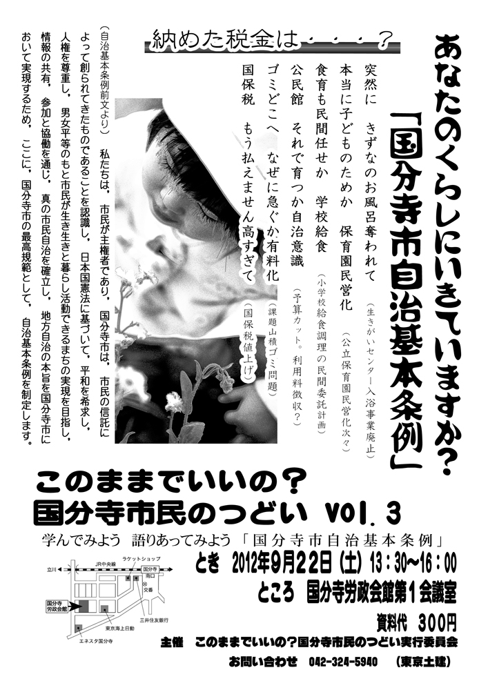 このままでいいの?国分寺市民のつどい vol.3 市政&地域情報 2012年09月13日 このままでいいの?国分寺市民のつどい vol.39月22日13時30分~ 労政会館第一会議室にて。資料代300円チラシ完成いたしました。今回は国分寺市の宝物「国分寺市自治基本条例」ができた経緯や課題について学びます。これすごいですよー。この条例自体に市民の努力が見えます。市民の声でできた条例です。そもそも・・・自治体の自治は「自主的に治める」の意。でもわたしたちは文句をいっていいやらいけないやらその心構えやタイミングもよくわかりません。わたしたち世代(ぶんじねこは高齢出産の育児世代です)以降は特に「団結」とか「連帯」などに実感をもてないまま成長した大人です。国分寺市のいろいろな福祉や暮らしにかかわることがカットされている今、わたしたちの市の自治について是非、考え、発展させ、共有してゆきましょう!もちろんつどいはどんな世代の方でもご参加ください。新婦人国分寺支部も実行委員会の一員として参加しています。pdf版は こちらをクリックして ダウンロードしてください。是非プリントアウトしてお友だちに伝えてください。 [2回]PR http://shinfujinbunji.ria10.com/Entry/46/このままでいいの?国分寺市民のつどい vol.3