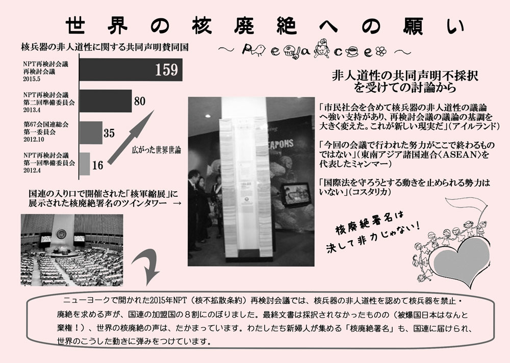 毎年新婦人では核兵器廃絶の署名と、ミニパンフレット配布を行いますが、今年はそれに「戦争法反対2000万署名」も訴えました。