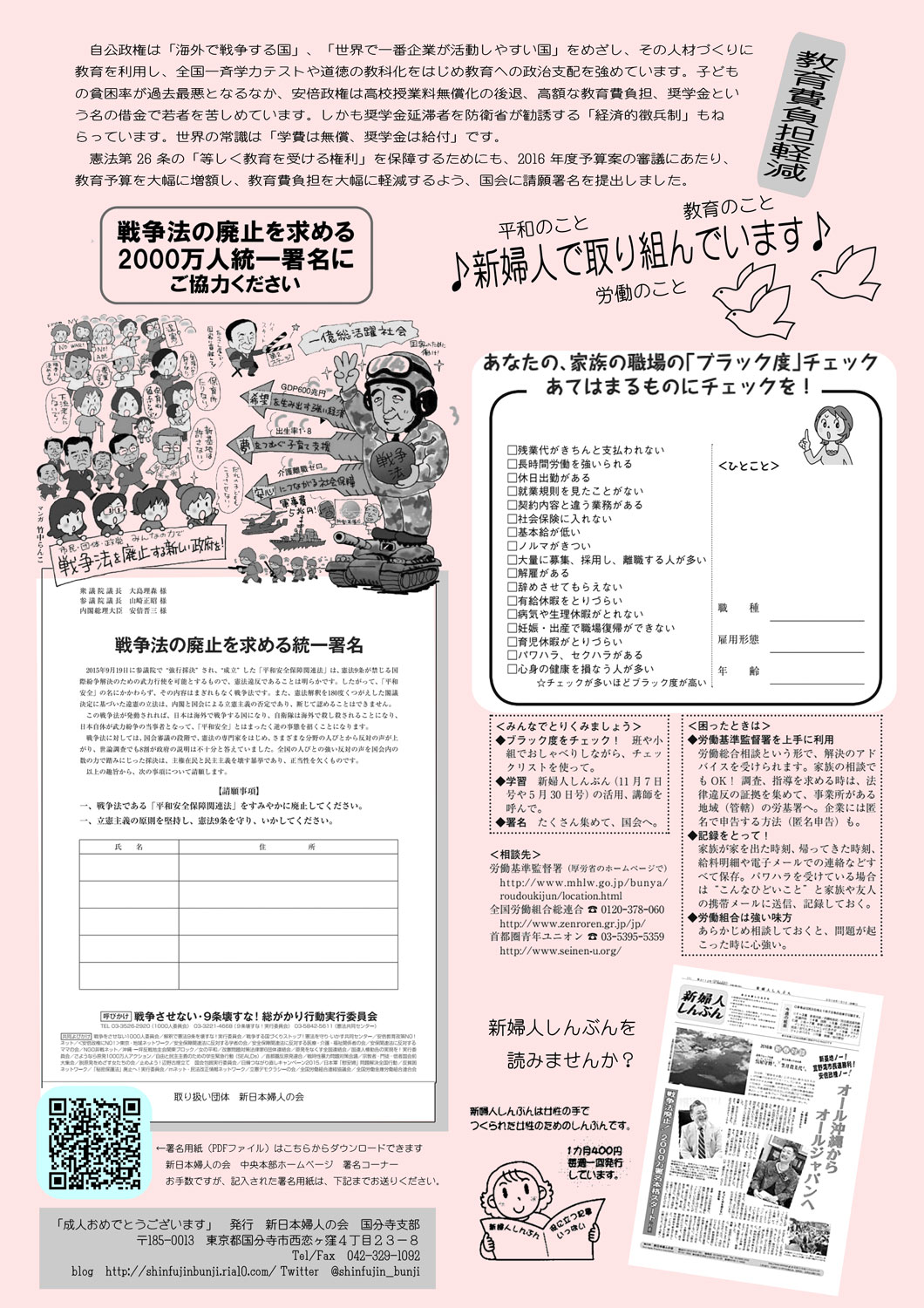 働く人のブラックバイトチェックや2000万署名の取り組み、核兵器廃絶の署名が国連に届いてどんな反響を得ているかなどを紹介したミニパンフです。